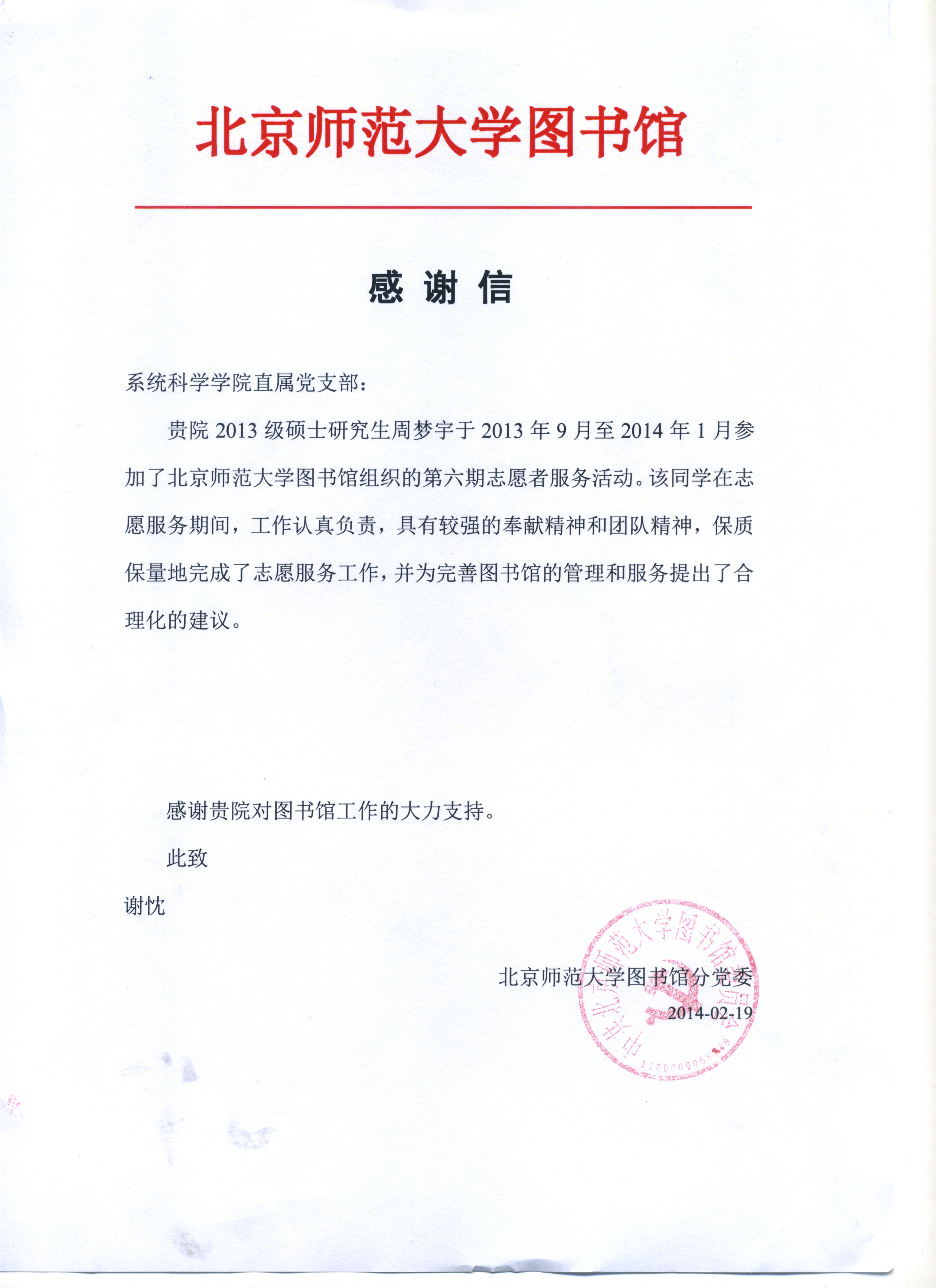图书馆致信感谢 av影片直播 周梦宇同学的志愿服务