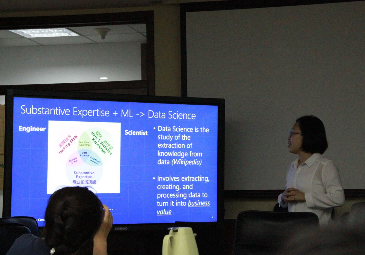 接着,任爽师姐从机器学习的历史讲起,介绍了机器学习的发展历程以及基本概念,指出机器学习旨在发掘数据背后的模式与关系,并结合自己在微软中国从事财务工作的经历,介绍了机器学习在公司营收预测方面的应用。之后,任爽师姐介绍了微软开发的机器学习平台Azure并通过不同品牌汽车销售量预测的例子,讲解了Azure平台的使用方法。